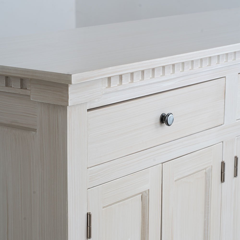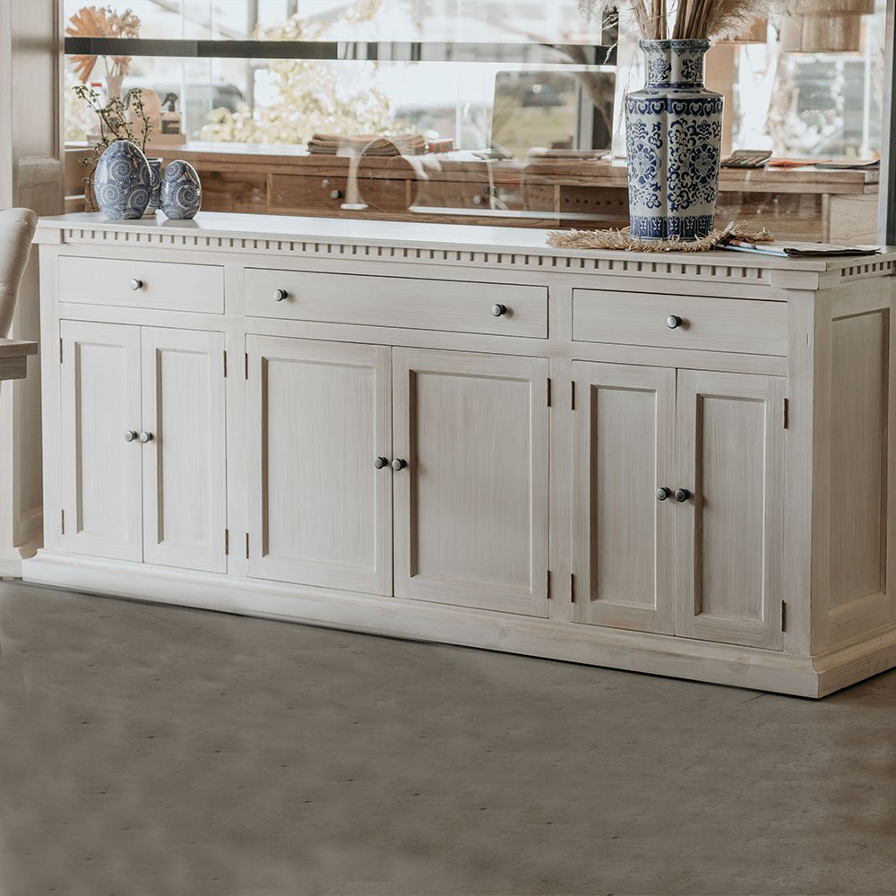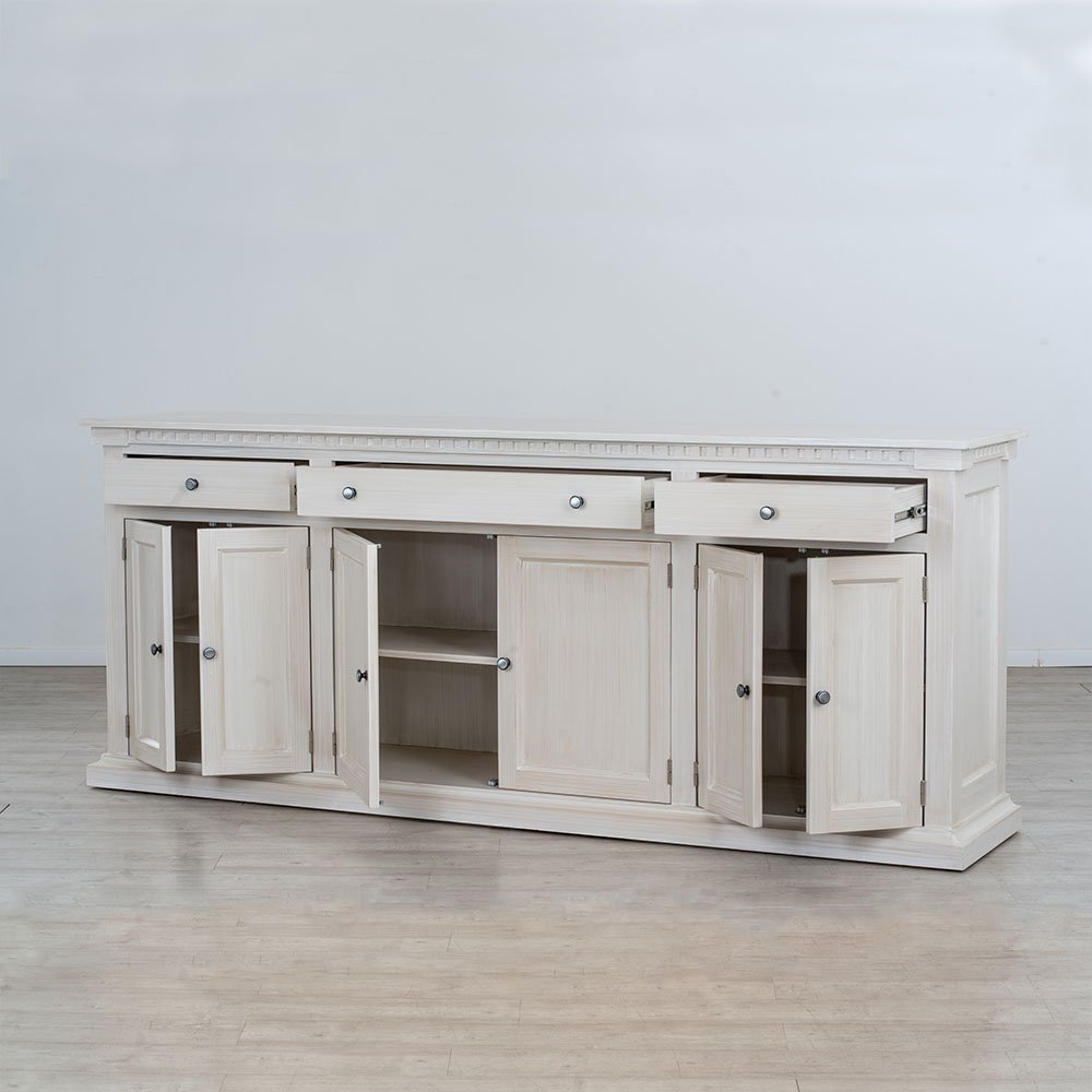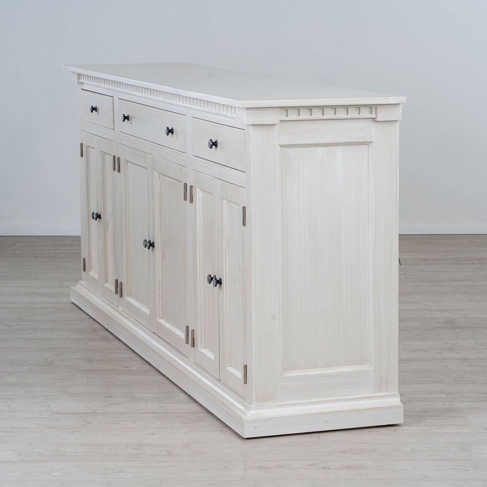 Construido en pino Oregón y MDF revestidos con base poliuretánica para recibir un acabado de pátina la cual posee 3 manos de capa protectora transparente para evitar deterioro prematuro de la pátina. Espigado tanto en puertas como bastidores de estructura que garantizan solidez y durabilidad.